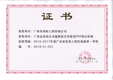广州市国际工程咨询公司申报的《广州北站综合交通枢纽开发建设PPP项目咨询》、《珠海市政府投资项目(学校类)建设标准及概算指标体系课题研究》、《广州临空经济示范区发展规划社会稳定风险分析报告》等九项成果荣获奖项。其中,一等奖3项、二等奖3项、三等奖3项。