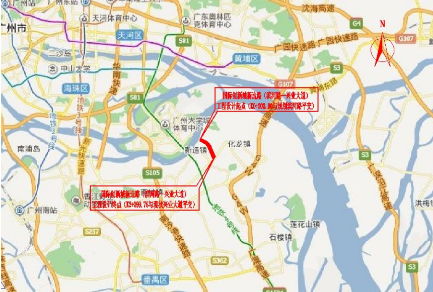 国际创新城新造路(滨河路—兴业大道)工程位于番禺区新造镇大学城南岸国际创新城启动区,北起滨河路,南至兴业大道,路线基本呈南北走向,道路设计全长约 2.1km,道路规划为城市次干路,规划红线标准段宽度为 40m,部分展宽段宽度分别为 45m、50m。项目建设内容包括道路、涵洞、照明、交通、市政管网及景观绿化工程等。根据道路建设需要,征收土地面积99067.05平方米。